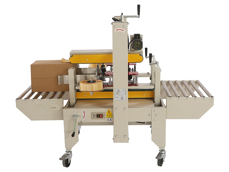 兩側邊封箱機WRS-50,本封箱機特點就是紙箱側放,進行兩側封箱,適 用於側邊開口的紙箱,如飲料、地磚等。封箱效果平整、規範、美觀;采用 即貼膠帶封口,經濟快速、容易調整,兩側邊貼帶封箱一道完成,方便、 快速、穩定。
